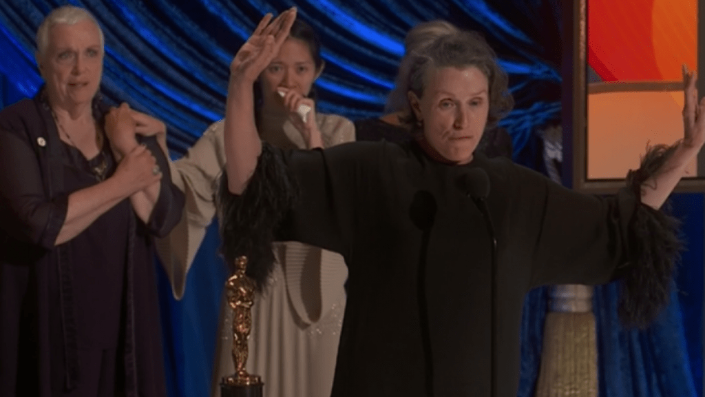 Frances McDormand dándole una bofetada a Disney + ©AMPAS La 93ª edición de los Oscars, celebrada el 23 de abril de 2021, tuvo un claro objetivo: reivindicar la experiencia cinematográfica. No era para menos. La crisis sanitaria causada por el COVID-19 provocó el cierre de salas, para muchas de ellas la situación no fue transitoria, y se retrasaron muchísimos estrenos. Llegar a los cines sin el respaldo de plataformas como Netflix, HBO Max, Disney + o Amazon Prime ha sido desde la primavera de 2020 un acto de valientes y entrar a las salas también lo es.